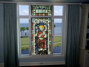 The top dedication window measures 31 x 15.5 inches. I installed it above the main church window, because our condo's window frame accomodated that perfectly. The dedication states: To the glory of God, and in memory of Ada Ellen Bayly {"Edna Lyall"}, who was born xxv th Feb: mcmiii