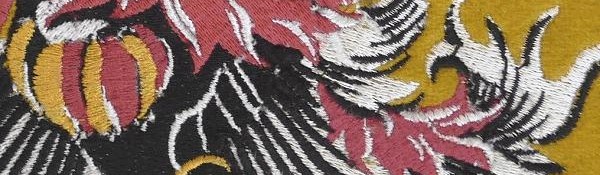 After some research I found a family in "The Olde Worlde" who embroidered everything by hand, using real silks and gold and silver bullion. The price was actually a bit cheaper. I have cut out the same area of the hand-embroidered crest for comparison.