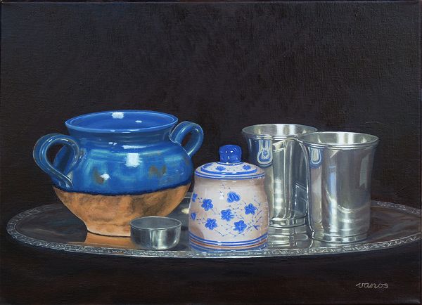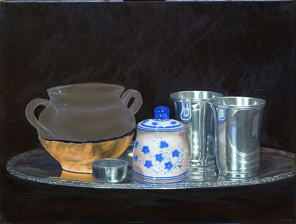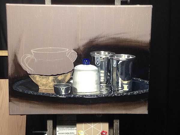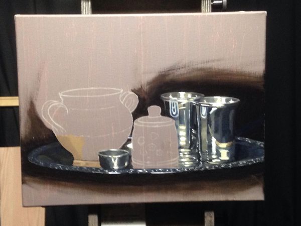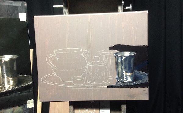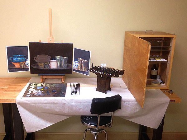 Oil painting classAfter having worked with pastels, on and off, for some 20 years, I decided to learn to paint in oil. I reviewed many artists online and found one, Mark Carder, whose work I like a lot, and who gave private lessons. The photo's were taken with an old cell phone and are rather poor, but give and idea. Still life setup.