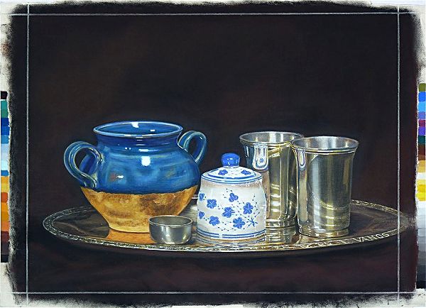 This is how far I got after 5 days. I left the painting there to dry and a month later it was shipped to me. I learned a lot, but the most important thing I learned was to look and relook at VALUES and subtlety of the colors compared to what you are painting. Hibernation After I came back I did not paint in oil for a year. Somehow I could not bring myself to start again. I had all the necessities, but thought oil too difficult. Can't teach an old dog new tricks. However, I liked my still life setup so much that I decided to go back to pastel and paint the still life in pastel from the photo I took at the workshop.