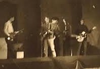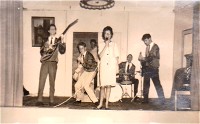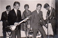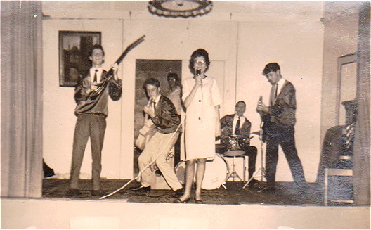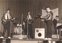 Een schoolavond van de examenklas van de Kalsbeek ULO in Concordia Woerden. Wij zijn uitgenodigd om te spelen. Wim heeft een (zwarte) electrische gitaar van Jaap Smallenburg geleend. Jaap Los speelt op Wim's nieuwe zelfgemaakte gitaar.