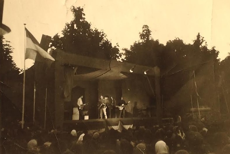 Onze versterker was kapot. Alleen Wim's gitaar aangesloten op de apparatuur de de "Rocking Explosives". We speelden Heathrock Four en The Stranger.